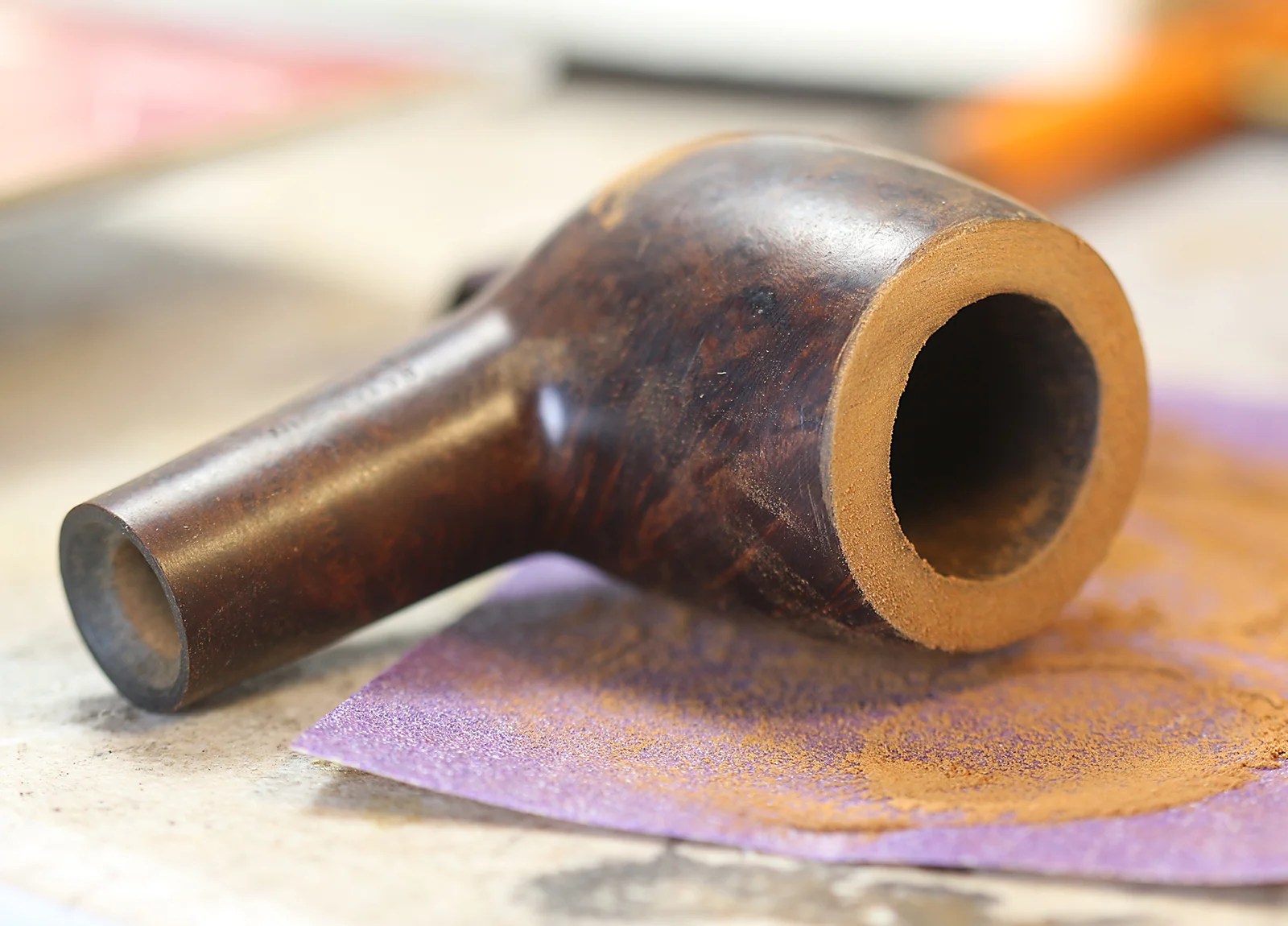 One trick to make a pipe look fresh is to give a slight bevel to the inner rim. This cuts away the black scarring at the edge of a non-beveled rim like this one. You have to get below the match burns and scorched edge for this to be effective. I use a dowel wrapped with sandpaper and angle it down into the chamber as I go around. I begin with 220 grit and move up the grades. I’ve noticed that the entire rim often needs a second sanding beginning again at 400 and going lightly to remove all the scratches.