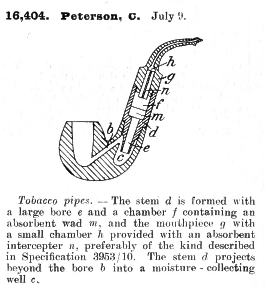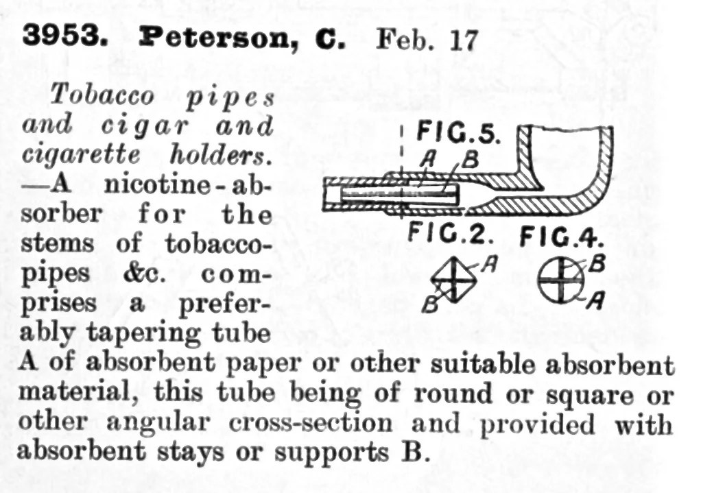 Peterson’s first patent filter pipe design dates from February 17, 1910, and involves a tapered filter of a “suitable absorbent material” and seems more like an idea he wanted to get to the patent office than one that in actual R&D. The idea here is similar Missouri Meerschaum’s throw-away paper filters, although Charles Peterson creates a better air flow with the funneled chamber between the filter and the draft hole.