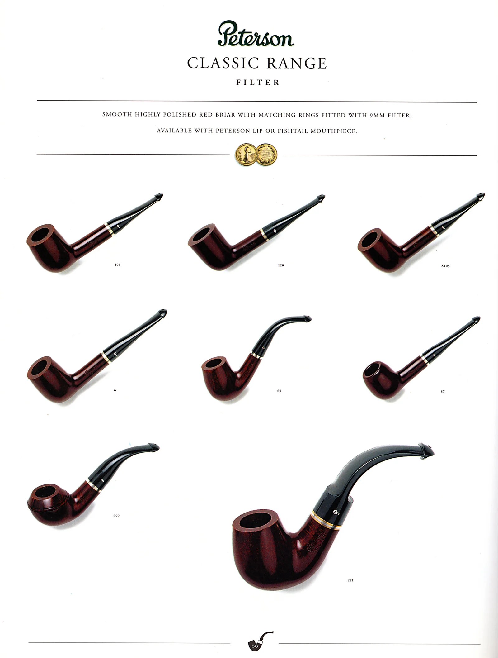 In 1997 two 9mm filter lines were seen in the first edition of the “Black” catalog, one in a smooth high-polish red, banded with brass-nickel-brass, in P-Lip or F/T. A slightly higher grade was also introduced, the Dublin Filter, which featured a smooth brown semi-matt finish banded with nickel-black acrylic–nickel, also in P-Lip or F/T.